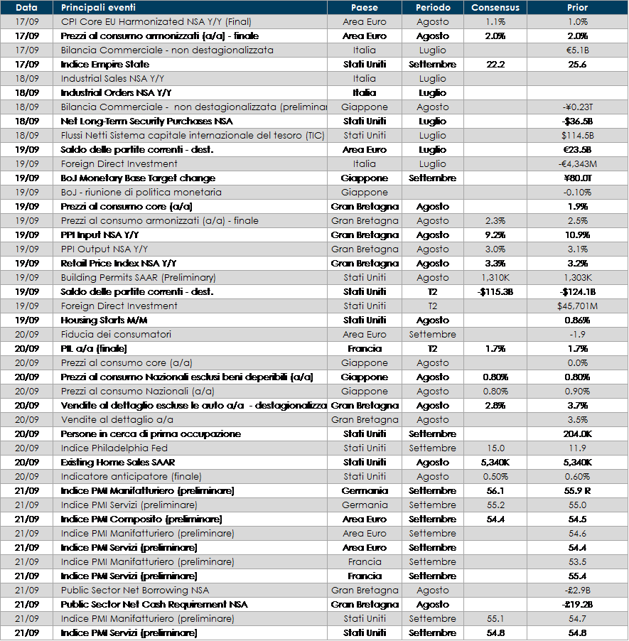 - Europa: l’attenzione sarà rivolta agli indici PMI di settembre.