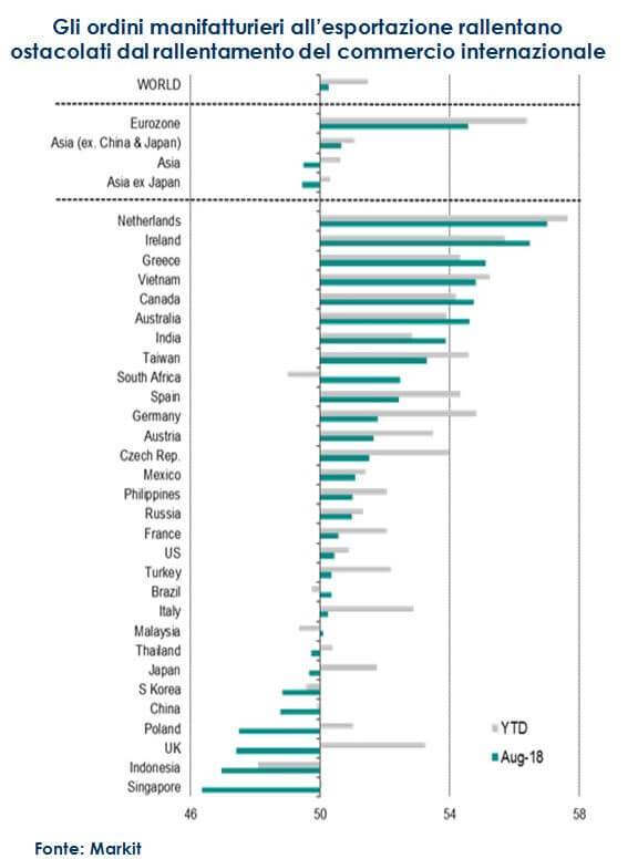 Gli ordini manifatturieri all’esportazione rallentano ostacolati dal rallentamento del commercio internazionale Fonte: Markit |