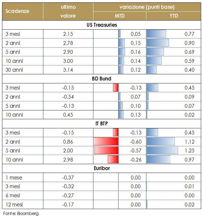 I fondamentali macroeconomici sono solidi, le condizioni finanziarei ancora accomodanti e lLa crescita degli utili favorevole. Restiamo positivi sul comporta azionario, anche se tatticamente, alla luce dell’accentuarsi di fattori di rischio, legati alle minacce di protezionismo US e all’aumento dell’incertezza politica in Europa, riteniamo opportuno ridurre marginalmente l’esposizione azionaria a favore di attivi denominati in USD.
