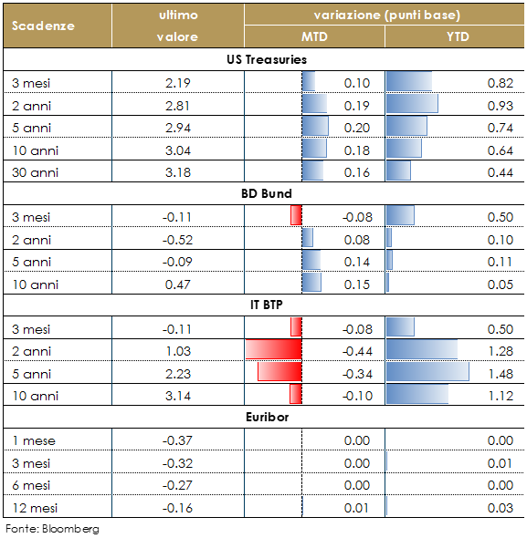 I rendimenti governativi dei principali paesi sviluppati sono aumentati generalmente di 15-25 pb nell’ultimo mese, riflettendo l’aumento dei tassi reali. L’aumento dei tassi reali riflette la solidità della crescita economica negli Stati Uniti. Tale crescita si è riflessa in settimana anche nell’aumento del costo del denaro implementato dal FOMC e nella moderata revisione delle previsioni di crescita del FOMC stesso. Il mercato governativo italiano ha risposto alla comunicazione del rapporto Deficit/Pil proposto per la Nota di aggiornamento al DEF con un marcato movimento di risk-off. Su tale movimento ha pesato la perdita di credibilità del Ministro Tria, che aveva più volte indicato l’1.6% come rapporto desiderabile per il deficit/PIL 2019, ribadendo la necessità di rimanere sotto la soglia del 2%. Il movimento ha riportato il differenziale di rendimento tra il decennale italiano e quello tedesco attorno a 270 pb. Il clima di avversione al rischio presente su tutti i mercati europei permette, invece, una discesa dei rendimenti dei paesi core, mentre non si assiste, almeno per il momento, ad un effetto contagio, considerando che gli spread degli altri paesi periferici verso quelli core restano sostanzialmente invariati. |