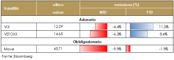 I fondamentali macroeconomici sono solidi, le condizioni finanziarei ancora accomodanti e lLa crescita degli utili favorevole. Restiamo positivi sul comporta azionario, anche se tatticamente, alla luce dell’accentuarsi di fattori di rischio, legati alle minacce di protezionismo US e all’aumento dell’incertezza politica in Europa, riteniamo opportuno ridurre marginalmente l’esposizione azionaria a favore di attivi denominati in USD. |