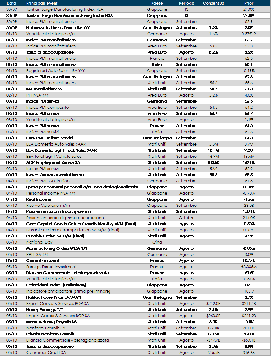 - Stati Uniti: attenzione rivolta alla pubblicazione dell’indice ISM manifatturiero per il mese di settembre e del report sul mercato del lavoro. Gli indicatori dovrebbero confermare lo scenario di espansione molto rapida in atto dalla primavera.