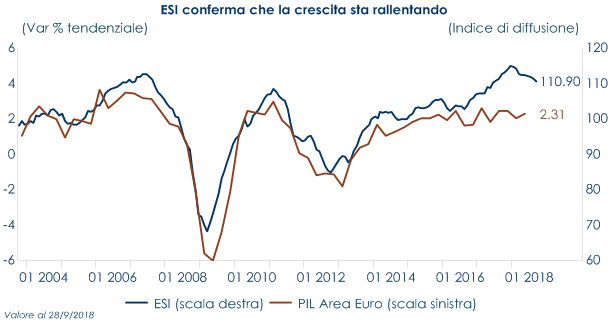 La produzione dell’industria tedesca ad agosto è scesa inaspettatamente per il terzo mese consecutivo a 0,3% m/m (consenso 0,2%, valore precedentre1,1%), guidata da una contrazione del settore dei beni strumentali e del settore delle costruzioni. In particolare, la debolezza nel settore dei beni strumentali è legata alla prosecuzione dell’effetto temporaneo “Procedura di test per veicoli leggeri armonizzati nel mondo” del mese scorso, che ha colpito l’industria automobilistica tedesca e che dovrebbe essere superato nei prossimi mesi. In Italia, la produzione industriale ha recuperato più del previsto in agosto, attestandosi a 1,7% m/m dal precedente -1,6% m/m del mese precedente (il dato di luglio è stato rivisto al rialzo da una precedente lettura di -1,8% m / m). L’aumento è stato diffuso, con i beni capitali in primo piano (+ 3,6% dopo il -2% m/m precedente). Anche i beni durevoli hanno registrato un forte rimbalzo (+ 5,8% da -4,7% m/m), mentre i beni non durevoli e intermedi sono variati poco (dopo aver ceduto -1,2% m/m ciascuno a luglio). L’energia ha contribuito positivamente, aumentando di + 2,8% m/m (dopo essere caduta nei due mesi precedenti). La produzione manifatturiera è leggermente aumentata rispetto all’indice generale (+ 1,5% m/m). La produzione industriale (su base annua, corretta per i giorni lavorativi) è rimasta in territorio negativo (-0,8% rispetto al precedente -1,3%). La produzione di gomma e plastica (-7,7% a/a) e legno, carta e stampa (-7,1% a/a) hanno pesato sulla variazione annua, mentre positivo è stato il contributo di macchinari e attrezzature, veicoli di trasporto, prodotti chimici, computer ed elettronica, tessuti e abbigliamento, altre manifatture. Complessivamente, il rimbalzo cancella il forte calo registrato a luglio, quindi la produzione industriale è stata leggermente modificata tra giugno e agosto. Tuttavia, la tendenza annua suggerisce che, l’attività economica nel settore manifatturiero stia chiaramente rallentando: luglio agosto il primo bimestre di calo dopo due anni di espansione ininterrotta (la più lunga da oltre 10 anni). A livello dell’intera Area l’Economic Sentiment Indicator (ESI) è sceso per il nono mese consecutivo da 111,6 a 110,9, portando l’indice al suo livello più basso in 15 mesi, pur restando coerente con una crescita economica abbastanza forte, poiché è scesa da un livello molto elevato alla fine dello scorso anno. Il rallentamento è stato guidato dal settore industriale, presumibilmente riflettendo l’impatto di una valuta più forte e una crescita più debole nei principali partner commerciali dell’Unione monetaria. L’indice del settore dei servizi, invece, è sceso meno nel corso dell’anno e è salito a settembre. A livello nazionale, l’indice ESI tedesco e italiano hanno rallentato ma solo moderatamente, implicando che l’incertezza politica non si è ancora riflessa nell’indice. Gli indici francesi e spagnoli sono diminuiti leggermente di più.