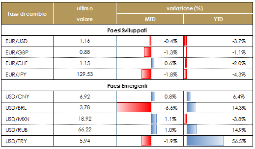 Le discussioni relative alla Brexit si sono intensificate in settimana, sostenendo la valuta britannica. Infatti, durante la settimana, la stampa ha riportato rumors più positivi sull’andamento dei negoziati: il WSJ ha riferito che i negoziatori britannici e dell’UE hanno ridotto le divergenze riguardo la questione del confine in Irlanda del Nord, con entrambe le parti convinte che sia possibile raggiungere un accordo prima del vertice del 18 ottobre. Contestualmente, il Times di Londra riporta che il primo ministro May potrebbe decidere di legare il futuro del proprio governo ad ulteriori compromessi sul piano Brexit la prossima settimana, quando delineerà una proposta che includa il mantenimento di UK in un’efficace unione doganale, ma con una chiara procedura per l’uscita. Settimana volatile per il dollaro statunitense, su cui da un lato ha pesato il dibattito in atto sulla politica monetaria della Fed e i commenti del Presidente Trump che ne ha criticato l’operato in tema di tassi di interesse, dall’altro la debolezza del dato di inflazione relativo al mese di settembre. Le difficoltà del dollaro si sono evidenziate anche nei confronti delle valute dei paesi emergenti, anche se l’ampiezza è stata diversa da paese a paese. |