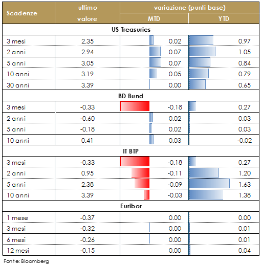 I titoli obbligazionari hanno segnato movimenti contenuti in settimana. Nelle prossime l’attenzione tornerà ad essere rivolta all’agenda politica europea ed in particolare: all’Italia, alla Brexit ed alla riforma dell’area Euro. Le scadenze restano incerte al pari degli effetti. L’Italia ha tempo fino al 13 novembre per inviare una proposta di bilancio aggiornato all’UE. Lo stesso giorno, la domanda di obbligazioni italiane verrà testata con un’asta BTP. Se l’Italia non modificherà l’attuale piano di bilancio (caso base), la Commissione Europea attiverà probabilmente una procedura di infrazione per i disavanzi eccessivi entro la fine di novembre (forse già il 21 novembre). Il rischio è che venga annunciata anche una sanzione. Negli Stati Uniti il mercato obbligazionario è rimasto spettatore sia di fronte alle elezioni di mid term sia di fronte al FOMC. Il mercato che continua a “leggere” negli statement della FED conferme per un rialzo a dicembre e un percorso che rimarrà graduale e “datadependent” nel 2019.