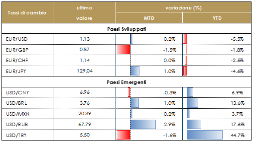 Riteniamo che le dinamiche commerciali e la rimodulazione delle attese future da parte della Fed guideranno il rafforzamento del dollaro fino alla fine dell’anno. La normalizzazione della politica monetaria si sta muovendo a ritmi diversi tra le banche centrali e i mercati hanno rimodulato le aspettative di politica monetaria. La Fed procede il suo percorso di rialzo del costo del denaro muovendosi verso la neutralità, mentre la BCE manterrà i tassi invariati fino all’estate 2019, terminando gli acquisti netti da dicembre dell’anno in corso e la Banca del Giappone ha lasciato la sua politica invariata ma ha rivisto al ribasso le stime sull’inflazione. Si è, dunque, ampliata la divergenza delle politiche monetarie. |