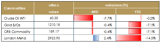 ASIA: nuove conferme sulla moderazione della crescita cineseL’indice PMI dei servizi elaborato da Caixin è sceso a 50,8 a ottobre (consenso 52.8, valore precedente 53.1), attestandosi al minimo da settembre 2017. La componente relativa al new business, pur restando ancora al di sopra della soglia di espansione è scivolata al valore minimo da novembre 2008. Miglioramenti marginali si sono registrati in termini di occupazione e redditività implicita. La debolezza dei servizi ha spinto il PMI composito a 50,5 da 52,1. Guardando all’inflazione, i prezzi alla produzione continuano a frenare. A ottobre l’indice registra un +3.3% su base annuale, il quarto rallentamento mensile consecutivo. A giugno l’indice era ancora al +4.7%. L’inflazione dei prezzi al consumo in ottobre è rimasta a 2,5% a/a, invariata rispetto a settembre, beneficiando in parte di un effetto base favorevole e in parte del calo dei prezzi degli alimentari (-0.3% m/m) dopo due mesi di aumenti mensili sostenuti, bilanciando gli aumenti nel comparto dei trasporti (+0,6% m/m; +3,2% a/a) e in quello dell’abbigliamento. La dinamica mensile delle altre categorie di spesa è rimasta contenuta. L’inflazione core è salita lievemente a 1,8% a/a da 1,7% a/a in settembre, rimanendo comunque sui minimi degli ultimi due anni. L’inflazione dei prezzi alla produzione è scesa a 3,3% in ottobre da 3,6% a/a, in particolare grazie al rallentamento dei prezzi dei beni del settore manifatturiero, e dovrebbe continuare a scendere nei prossimi mesi in linea con il calo del prezzo del petrolio. La dinamica inflativa rimane, quindi, contenuta e non pone freni ad un ulteriore allentamento delle condizioni monetarie nei prossimi mesi. Il surplus commerciale cinese si è attestato a $34 miliardi in ottobre (consenso $ 35 miliardi, mese precedente $ 31,7 miliardi). Le importazioni, che hanno inaspettatamente accelerato al 21,4% a/a (consenso del 14,0%) rispetto al precedente 14,3%. Le esportazioni si sono attestate a 15,6% (consenso del 12,0%, mese precedente 14,5). Al di sotto di questo dato potrebbe esserci un atteggiamento del consumatore che ha anticipato i propri acquisti per evitare tariffe più elevate in futuro e questo lascerebbe ipotizzare un rallentamento in futuro. In Giappone i salari reali giapponesi sono scesi per il secondo mese consecutivo in settembre attestandosi a 0.4% a/a (mese precedente 0,7% a/a), invece i salari nominali sono cresciuti di 1,1% a/a (mese precedente 0,8% a/a). La decelerazione delle remunerazioni standard è stata controbilanciata dal calo dei pagamenti speciali. Gli ordinativi in macchinari giapponesi hanno registrato un calo marcato dopo il terremoto di Hokkaido e degli eventi meteorologici del tifone: gli ordini core sono scesi del 18,3% m/m a settembre (consenso -9,9% mese precedente 6,8%). La spesa delle famiglie in Giappone è scesa inaspettatamente dell’1,6% a/a in settembre (consenso1,5% mese precedente 2,8%). In termini destagionalizzati, la misura al netto della spesa per abitazioni è scesa dell’1,9% m/m (valore precedente 3,1%).