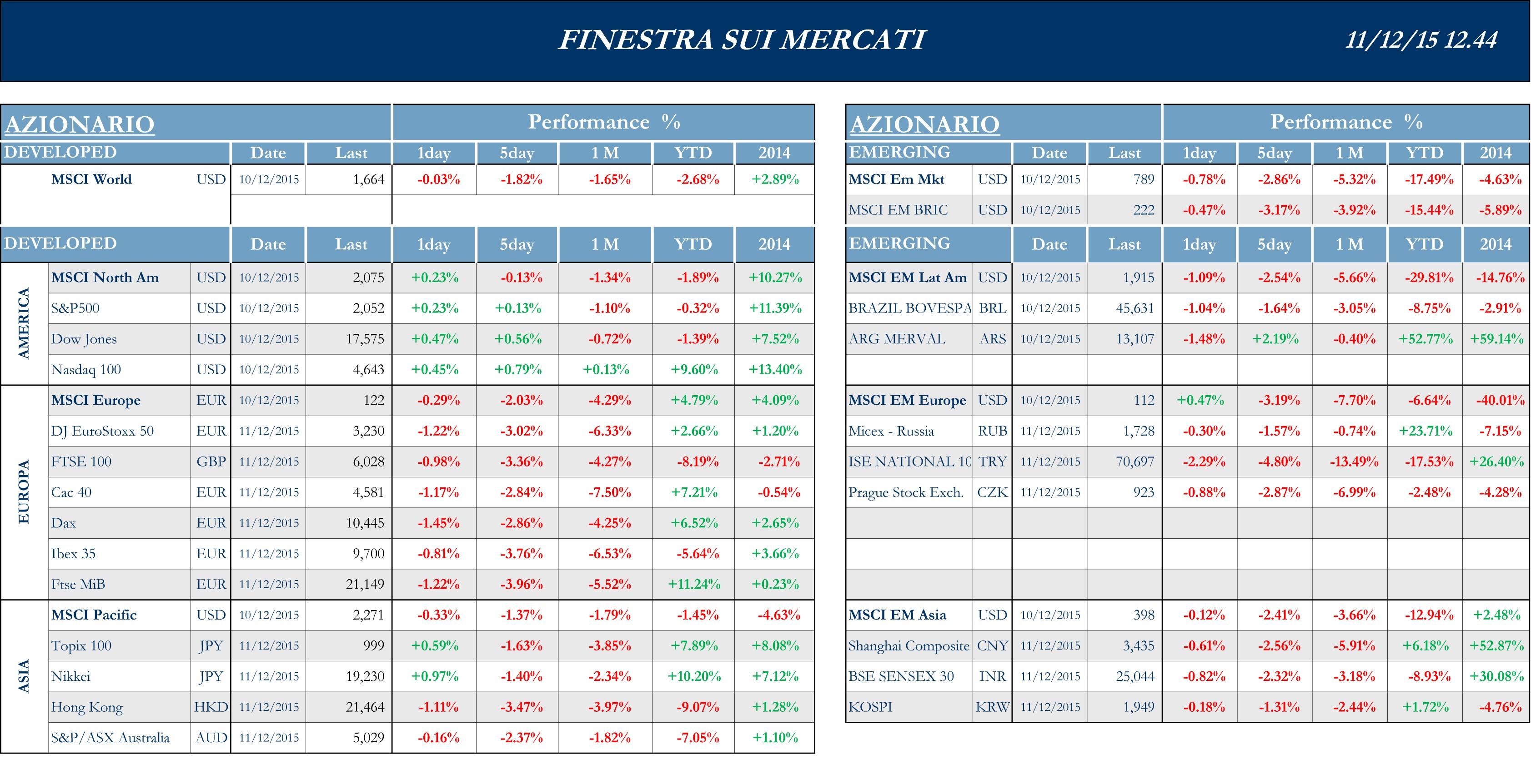 Dopo il forte rialzo registrato nell’ultima seduta della scorsa settimana, conseguente alla pubblicazione del report sul mercato del lavoro, la prima metà della settimana corrente è stata caratterizzata da un andamento negativo dei listini. A pesare sugli indici azionari sono sostanzialmente i titoli energetici e legati alle materie prime, in ribasso a causa del continuo calo dei prezzi delle commodities ed in particolare del greggio. La settimana è stata, inoltre, caratterizzata dal più forte rialzo nella volatilità, dei listini, dopo i picchi registrati quest’estate, con gli investitori sempre più nervosi e incerti sulle decisioni di asset allocation, anche in considerazione delle decisioni che la FED prenderà la prossima settimana in relazione al rialzo dei tassi d’interesse. A livello macro, intanto, l’indice NFIB sull’ottimismo delle piccole imprese è arretrato in novembre rispetto al mese precedente, secondo gli analisti, tuttavia, i numeri sono legati all’influenza della situazione geopolitica globale. Le scorte all’ingrosso su base congiunturale di ottobre, al contrario di quanto atteso dagli analisti, si è attestato in lieve contrazione, mentre il dato sulle vendite all’ingrosso rimane attorno allo zero. I listini statunitensi tornano a chiudere in rialzo giovedì. La salita arriva assieme all’ulteriore rafforzamento del dollaro, coll’ormai crescente sicurezza sul rialzo dei tassi da parte della FED nel meeting della prossima settimana. Il movimento del mercato azionario ha ignorato le indicazioni, non positive, provenienti dal mercato del lavoro, con le richieste settimanali di sussidi di disoccupazione in crescita. Da notare, sempre sul fronte macro, come i prezzi dei beni importati siano scesi a novembre meno di quanto atteso. Il dato arriva nonostante il rafforzamento del dollaro sulle divise dei principali partner commerciali e potrebbe dimostrare la domanda interna sostenuta, oltre e soprattutto, a scongiurare il rischio deflazione.