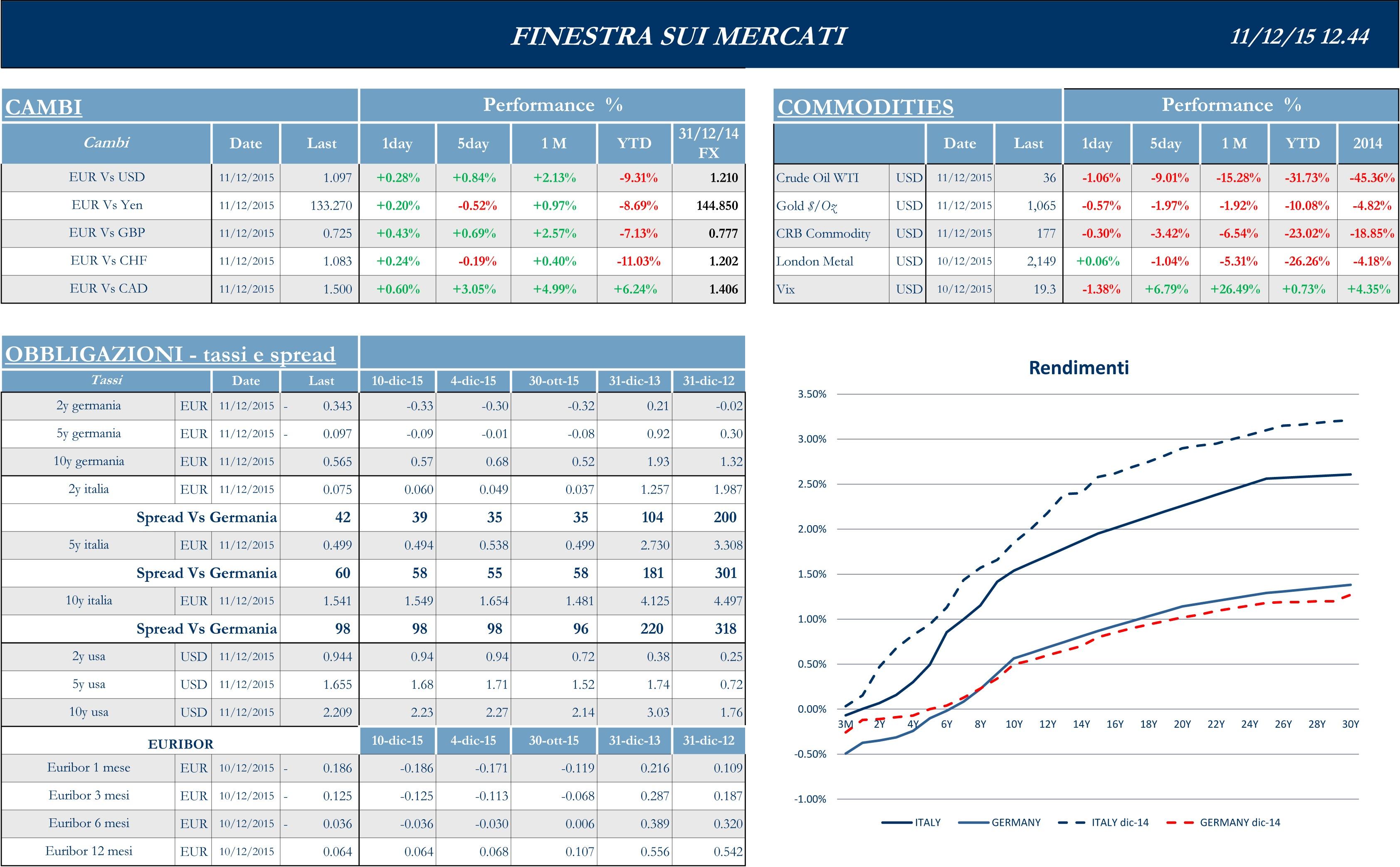 Usciti, nell’ultimo giorno della settimana, i dati relativi alla produzione italiana in rialzo rispetto ai valori di ottobre e superiori alle attese degli analisti: su base mensile l’indice si colloca a 0.5% (vs. 0.3% attese e 0.2% di ottobre), mentre YoY segna 2.9% (vs. 2.0% atteso e 1.7% di ottobre). I dati assumono una maggiore importanza dopo il non brillante andamento del Pil nel terzo trimestre e le indicazioni, sia del governo sia dell’Istat, sul fatto che difficilmente potrà essere raggiunto il target di crescita dello 0.9% inserito dell’aggiornamento del DEF. Al contrario deludono i dati industriali in Germania, ampiamente sotto le attese, anche se l’economia tedesca è in continua espansione, grazie ai consumi privati, con una piccola spinta anche dai rifugiati: è quanto emerge dal rapporto mensile del ministero dell’Economia tedesco, secondo cui la Germania sta subendo il difficile contesto economico mondiale anche se l’aumento dell’occupazione e dei salari, insieme ai bassi prezzi del petrolio e alla debolezza dell’euro, stanno sostenendo l’economia. View parzialmente confermata dall’istituto tedesco Ifo che ha abbassato le previsioni sulla crescita della Germania nel 2015, ma ha preannunciato un’accelerazione l’anno prossimo. Secondo l’istituto con sede a Monaco, quest’anno Berlino registrerà una crescita del Pil pari all’1.7%, dato rivisto rispetto all’1.9% stimato a giugno. Per quanto riguarda il 2016, l’Ifo si attende un aumento del Pil dell’1.9%, meglio dell’1.8% previsto in precedenza.
