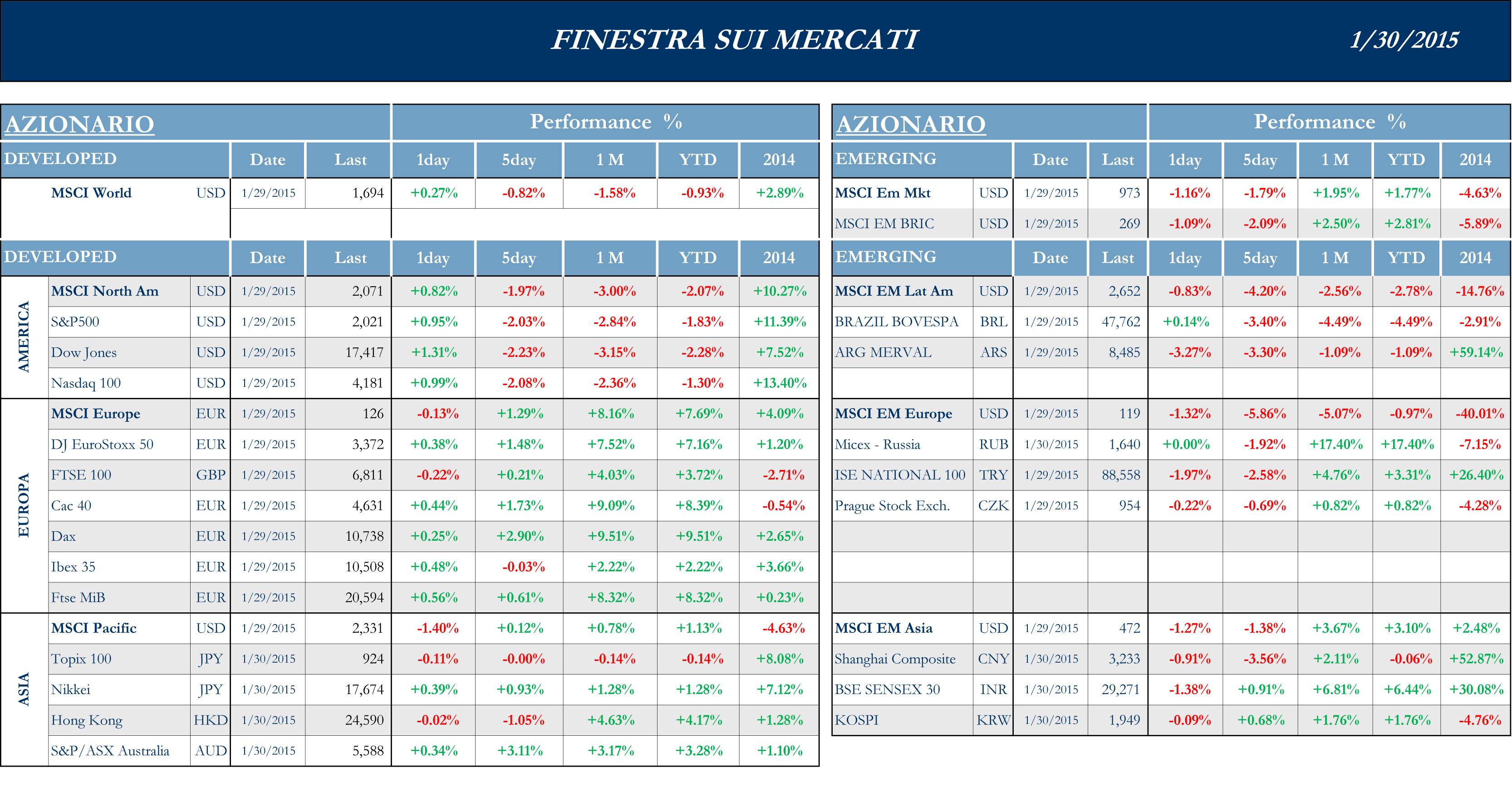 I mercati azionari europei hanno reagito meglio del previsto al risultato delle elezioni anticipate in Grecia. Gli investitori sembrano prendere con “beneficio d’inventario” le affermazioni di Tsipras che sembrano parallele alle sue dichiarazioni in campagna elettorale, ma che dovranno fare i conti con il fatto che la Troika è il “prestatore di ultima istanza” per le banche elleniche. Quindi per molti commentatori è ovvio che gli slogan antieuropei dovranno essere stemperati dalla realtà dei fatti. Ulteriori segnali potrebbero venire dall’incontro tra Tsipras e il presidente dell’Europarlamento Schultz nel la giornata di venerdì.