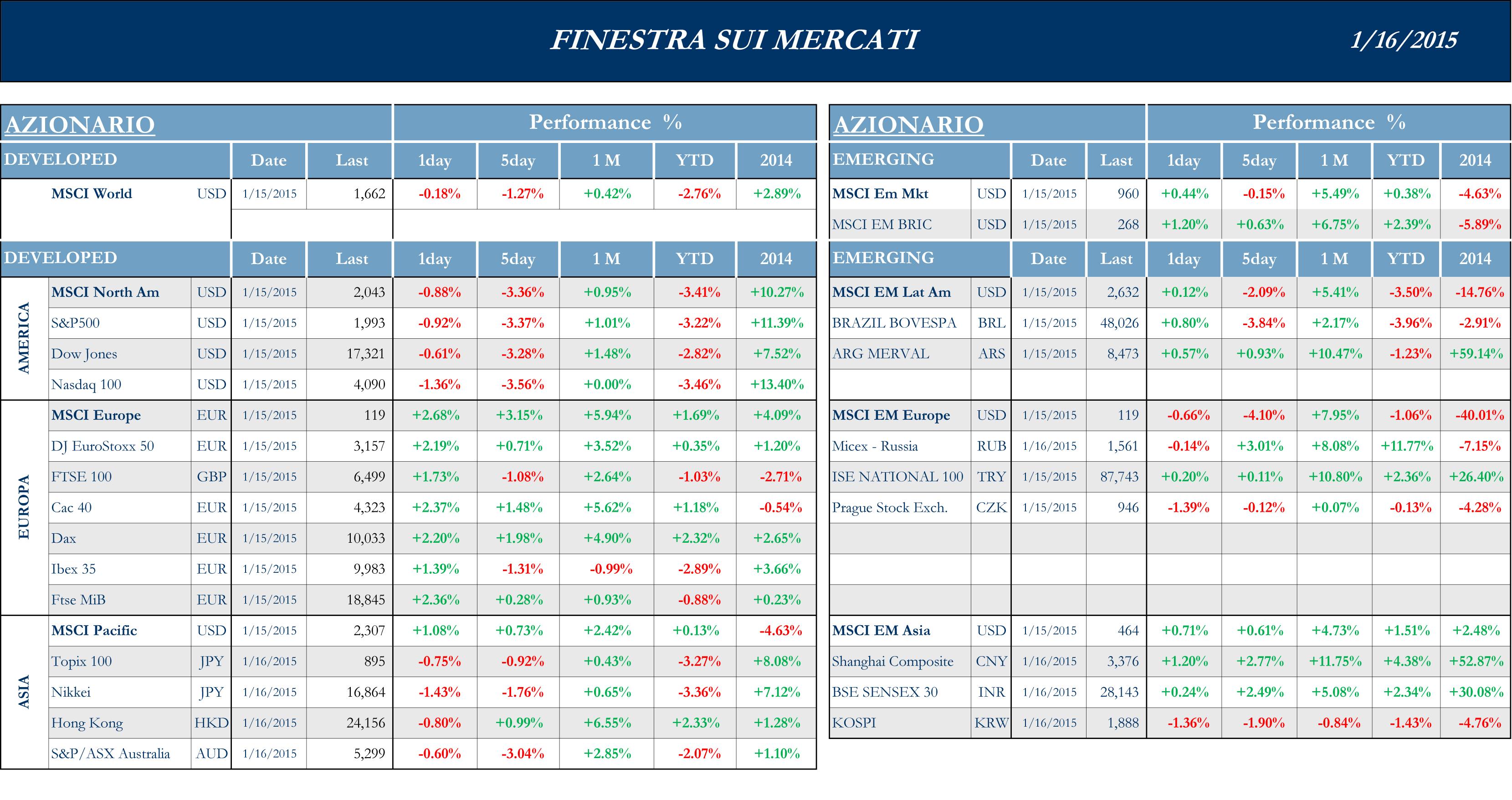 I mercati azionari europei hanno mostrato la miglior performance, in termini di blocchi continentali, in attesa dell’annuncio del Quantatitative Easing che sembra ormai imminente e sembra essere stato anticipato dalla mossa a sorpresa della Banca Nazionale Svizzera. L’abbandono del livello minimo di cambio sembra in effetti a molti analisti una mossa anticipatoria. Nel caso il QE venisse lanciato il tetto sarebbe stato infinitamente costoso da mantenere in essere. Quindi meglio agire prima, anche a costo di scatenare, come puntualmente successo, l’ira di tutti i CEO dei grandi esportatori elvetici. In chiusura di settimana spicca il commento da parte del Fondo Monetario Internazionale. Il Managing Director di IMF, Christine Lagarde ha affermato che il prezzo del petrolio al livello attuale e la ripresa economica in America non saranno sufficienti a risollevare l’economia globale che necessita politiche audaci per evitare un periodo di sviluppo mediocre, visto che, a sei anni dall’esplodere della crisi globale il mondo fa fatica a riprendersi. La domanda deve essere urgentemente supportata da importanti investimenti infrastrutturali. Negli ultimi giorni sembra calato il nervosismo in merito alle elezioni in Grecia.