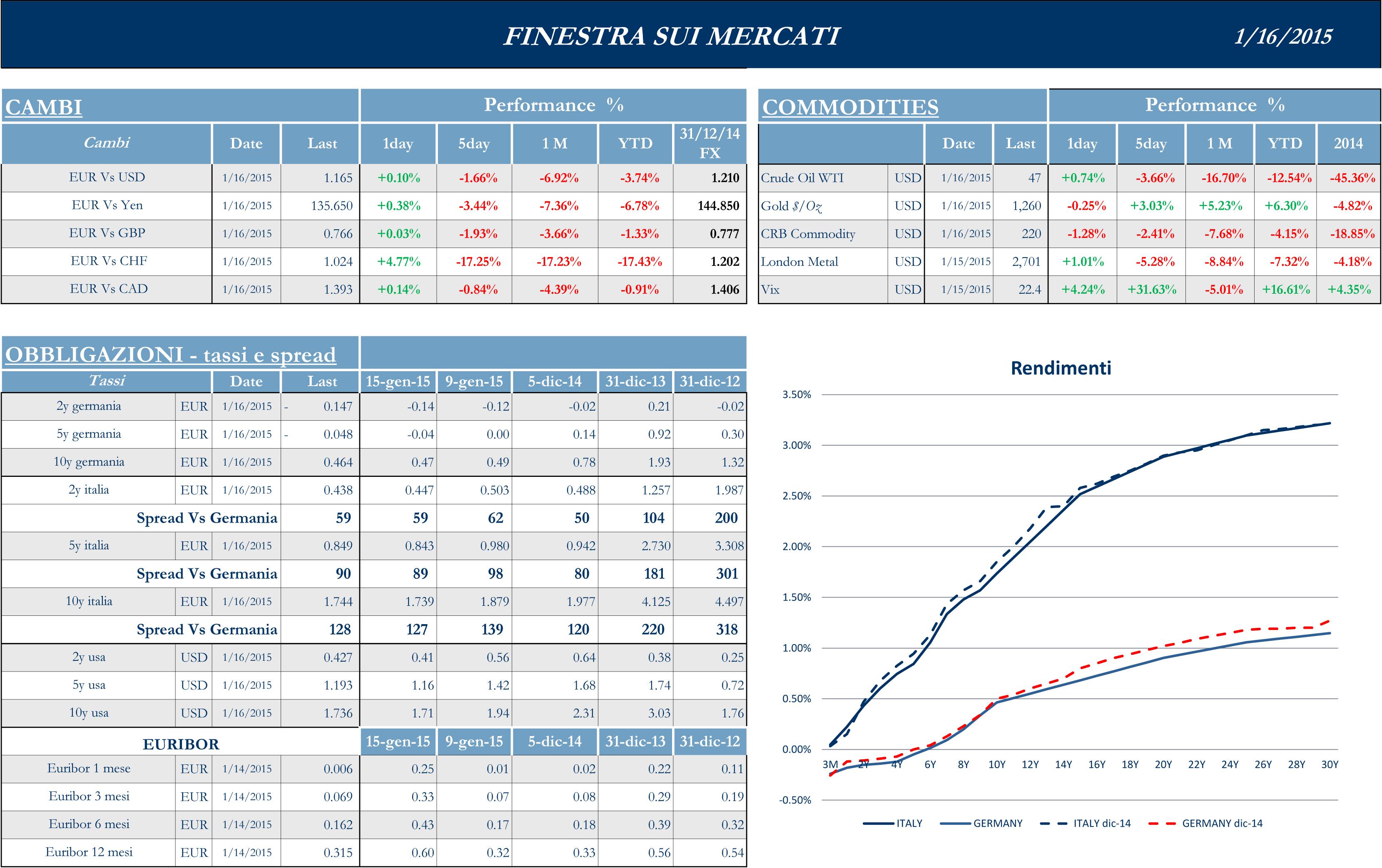 Il Beige Book, ha evidenziato per tutti i distretti una crescita economica che va da “modesta” a “moderata” e il livello del prezzo del petrolio appesantisce a questo proposito aree come il Texas. Le vendite al dettaglio sono risultate decisamente sottotono: la lettura per il mese di dicembre è stata pari a -1% contro attese flat. Inoltre il dato del mese precedente è stato rivisto da 0.1% dallo 0.5% pubblicato. È partita la Reporting Season relativa al 4Q 2014 e, come al solito, è Alcoa a inaugurare la stagione delle trimestrali, mostrando numeri migliori delle aspettative, con domanda in crescita più del previsto da parte dei settori Automotive ed Aerospace. Il Leader mondiale dell’alluminio ha affermato che la domanda globale crescerà nel 2015 del 7%. I numeri dimostrano la validità della strategia intrapresa, che ha visto Alcoa muoversi lungo la filiera, eliminando molti siti di raffinazione e concentrandosi su processi a valle ad alto contenuto tecnologico, come i componenti per l’industria aerospaziale. JPM ha pubblicato una trimestrale marginalmente migliore delle attese, ma ha visto ridursi drasticamente il risultato derivante dal Fixed Income Trading e le Legal Expenses ancora inaspettatamente più alte delle previsioni per una serie di “litigation” ancora aperte. Analogamente Wells Fargo, che al momento è la banca americana con capitalizzazione più elevata ha visto crescere le voci legate ai costi per il Risk Control and Management e le spese per il personale, pur arrivando ad un EPS sul trimestre leggermente migliore delle aspettative. Negativa invece la trimestrale di Citigroup: EPS a 6 cents contro 9 attesi. Anche per il gruppo guidato da Corbat il problema è il FI Trading che non è diminuito del 5% QoQ, come anticipato dal CEO, ma ben del 14%.