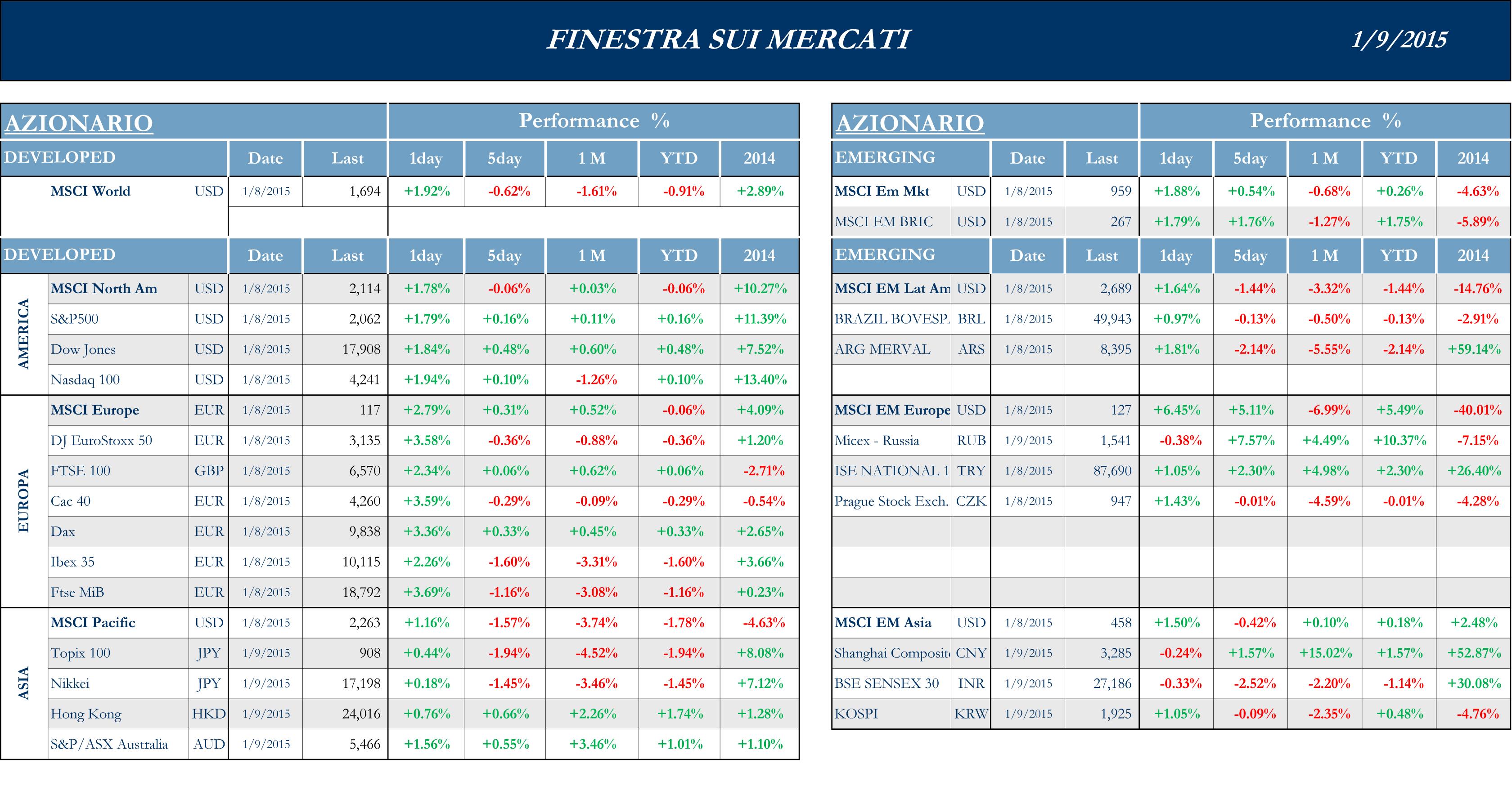 La prima settimana dell’anno ha visto gli indici americani subire una notevole ondata di volatilità anche se minore rispetto a quanto visto per l’area Euro; l’attenzione degli analisti USA, e non solo, era focalizzata su due principali eventi: la pubblicazione delle ultime minute del FOMC e il Labor Report, che è stato reso disponibile nel pomeriggio di venerdì. Dalla lettura delle minute emerge che la Federal Reserve sembra essere soddisfatta dal progresso in merito alle proprie politiche, mentre non sembra essere particolarmente allarmata dai rischi derivanti dalla discesa del prezzo del petrolio, dalla bassa inflazione e dal rallentamento della crescita globale. Il tono della FED si sta comunque facendo progressivamente meno “Dovish”: i mercati percepiscono l’inizio del rialzo dei tassi per agosto, ma alcune case cominciano a domandarsi se i dati sull’occupazione, nettamente migliori delle attese, potrebbero anticipare l’orizzonte degli eventi addirittura ad aprile. A questo proposito la pubblicazione dei dati del Labor Report ha evidenziato che la creazione di nuovi posti di lavoro non sembra avere perso la propria spinta (con un numero di nuove buste paga a +240K, contro +228K attese) e il tasso di disoccupazione si contrae ulteriormente dal 5.7% al 5.6%.