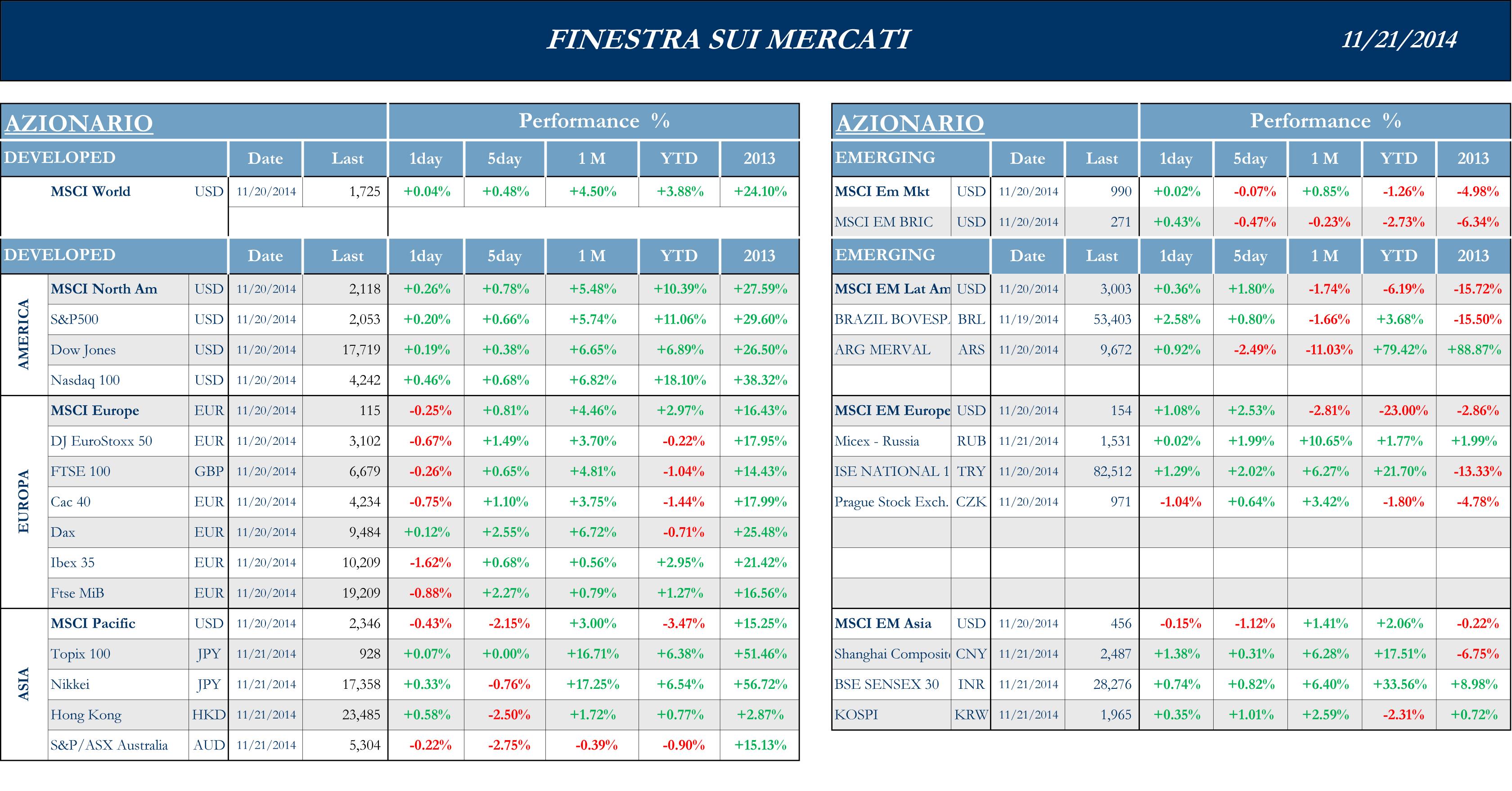 In Asia, dopo i primi due giorni di utilizzo, il link con Shanghai ha visto ridursi il flusso degli ordini a soli 180 milioni di dollari, ridando voce agli scettici sull’argomento, che hanno soprannominato l’operazione “Ghost Train” (il treno fantasma), rispetto all’originario “Through Train”, il diretto che doveva portare gli investitori su Shanghai e che risale a un progetto originario del 2006. In Cina è stato pubblicato l’indice preliminare redatto da Markit ed HSBC, che indica come l’economia stia rallentando. Il dato 50.0, atteso a 50.2 ed inferiore al 50.4 precedente, indica soprattutto un calo nei “fixed assets” e la necessità di fornire ulteriore stimolo all’economia di Pechino in un momento che vede le banche cinesi riportare la peggior accelerazione delle sofferenze su crediti dal 2005. Pechino deve fronteggiare la crescita economica più debole dal 1990, mentre i leader si interrogano su quale dovrà essere il target di crescita per l’economia nel 2015.