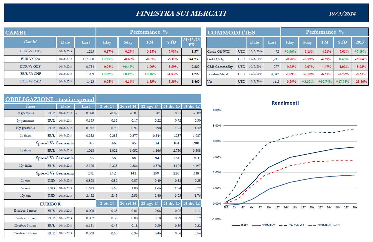 I mercati azionari europei si sono dimostrati questa settimana i peggiori performer in assoluto. La dinamica delle Borse ha risentito della delusione degli operatori in merito alla conferenza successiva al meeting della BCE a Napoli (dove Mario Draghi, pur preoccupato per la debolezza della ripresa, non ha ancora messo mano a misure straordinarie) e dalla spaccatura che emerge in seno all’Eurozona, dove la Francia sembra rifiutare al momento la politica del rigore, fondamentale invece per la Germania. L’indice di Milano, nonostante la chiusura vicina al -4% della sessione di Giovedì, sembra avere contenuto le perdite rispetto alla media dei mercati continentali.
