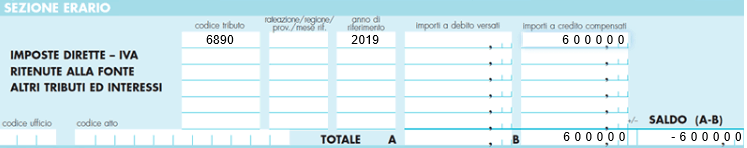 In sede di compilazione del modello di pagamento F24 il codice tributo “6890” va esposto nella sezione “Erario”, in corrispondenza delle somme indicate nella colonna “importi a credito compensati”, ovvero, nei casi in cui il cessionario debba procedere alla restituzione del credito compensato, nella colonna “importi a debito versati”.