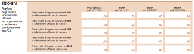 Nella sezione VI sono infine riepilogati i crediti d’imposta oggetto di riversamento su ciascuna annualità, con le relative scadenze.