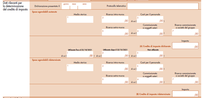 Nel riquadro vanno esposti tutti i dati e le informazioni rilevanti ai fini del calcolo del credito di imposta R&S dichiarato e rideterminato su ciascuna annualità.