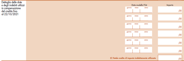Va inoltre indicata la quota di credito utilizzata in compensazione entro e oltre il 22.10.2021 e quella non utilizzata: la procedura è esperibile solo per crediti indebitamente compensati al 22.10.2021.