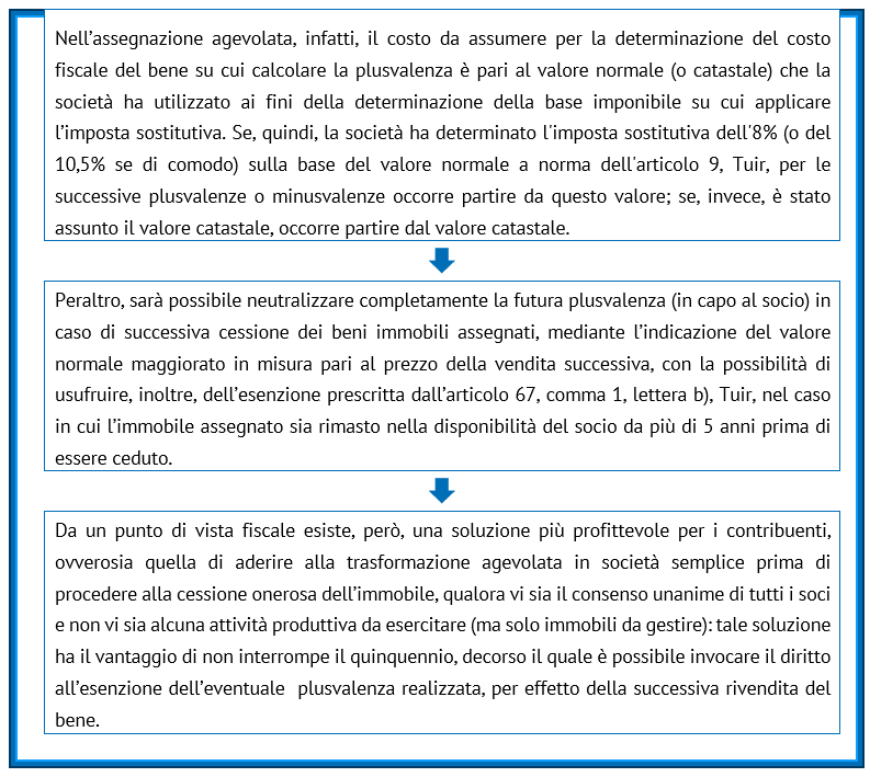 Il suddetto carico impositivo potrebbe essere alleggerito facendo transitare i beni dalla sfera giuridica della società a quella dei soci che potrebbero successivamente rivendere direttamente il bene: le cessioni immobiliari effettuate da tali soggetti, rispetto alle analoghe cessioni operate dalla società commerciale, potrebbero godere, infatti, del significativo vantaggio di non far maturare plusvalenze imponibili o di realizzarle solo in misura parziale: nell’assegnazione agevolata, infatti, il costo da assumere per la determinazione del costo fiscale del bene su cui calcolare la plusvalenza è pari al valore normale (o catastale) che la società ha utilizzato ai fini della determinazione della base imponibile su cui applicare l’imposta sostitutiva.