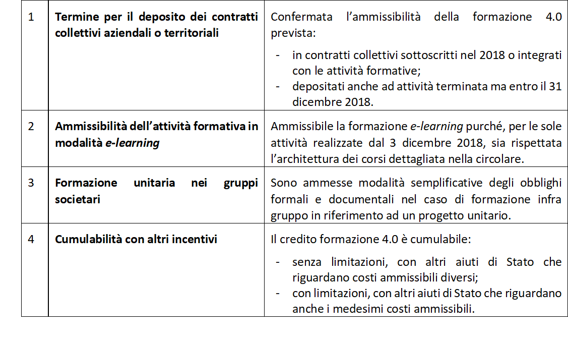 È confermata la possibilità di assolvere tale requisito formale successivamente al sostenimento delle spese di formazione ma entro il 31 dicembre 2018, la possibilità di integrare contratti collettivi aziendali o territoriali sottoscritti prima dell’entrata in vigore del D.M. 04.05.2018 e l’ammissibilità di integrazioni ai contratti collettivi che riguardano esclusivamente l’attività formativa.