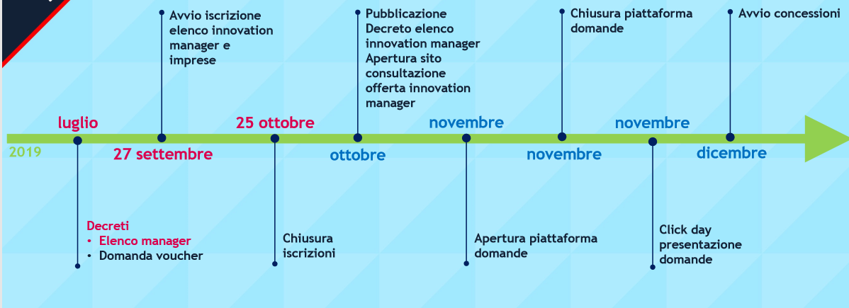 Con l’approssimarsi dell’apertura delle iscrizioni all’apposto elenco Mise degli “innovation managers”, prevista a partire dalle ore 10:00 del 27.09.2019 fino alle ore 17:00 del 25.10.2019, si riepilogano le caratteristiche e tratti procedurali dell’incentivo, nonché la timeline della misura agevolativa, in base alle informazioni rese da Mise e Invitalia nella presentazione del 26.07.2019 pubblicata sul sito istituzionale del Ministero.