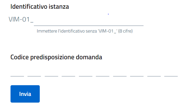 - il numero identificativo dell’istanza, presente nel footer dell’istanza firmata e composto dal codice VIM-01 seguito da otto cifre;