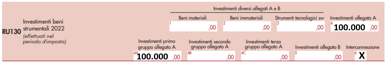 Inoltre, l’impresa dovrà indicare al rigo RU130 della sezione IV del quadro RU quanto segue (si è ipotizzato che il bene appartenga al primo gruppo dell’allegato A annesso alla L. 232/2016):