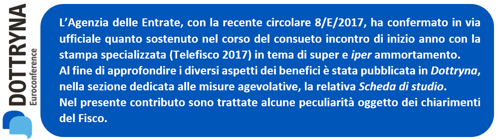 Sul punto, la circolare AdE 8/E/2017 ha precisato che può beneficiare solo del super ammortamento e non dell’iper ammortamento un bene compreso nell’Allegato A alla legge di Bilancio 2017, acquistato nel 2016 e entrato in funzione ed interconnesso nel 2017. In tal caso, la maggiorazione del 40% può essere fruita dal 2017, periodo d’imposta di entrata in funzione del bene, mentre l’interconnessione non assume alcuna rilevanza.