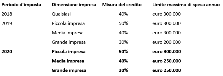 - risultano modificati e parificati a euro 250.000 i limiti massimi annuali di spesa agevolabile per medie e grandi imprese, fatte salve le medesime aliquote modulate in funzione della dimensione d’impresa introdotte dall’articolo 1, commi 78–81, L. 145/2018 (c.d. Legge di Bilancio 2019);