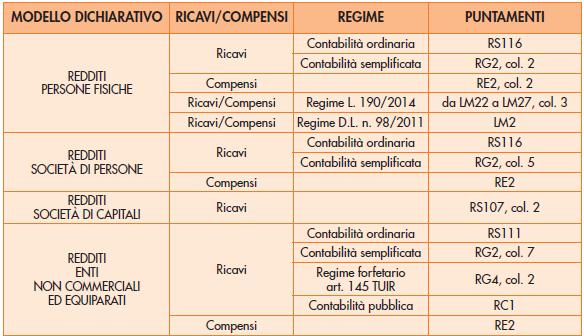 Si evidenzia che al fine di semplificare ed evitare errori nel processo di determinazione dei ricavi/compensi relativi al 2019, le istruzioni riportano la seguente tabella riepilogativa dei campi della dichiarazione dei redditi (2020 per il 2019) ai quali far riferimento: