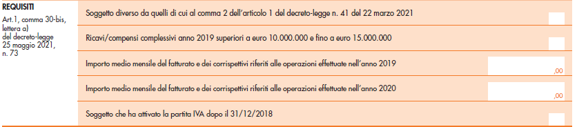 - nel caso in cui, invece, la differenza di cui al punto precedente risulti positiva o pari a zero, il contributo è pari all’importo di euro 1.000 per le persone fisiche e di euro 2.000 per i soggetti diversi dalle persone fisiche. Per la richiesta del contributo Sostegni va compilata la seguente Sezione dell’istanza:
