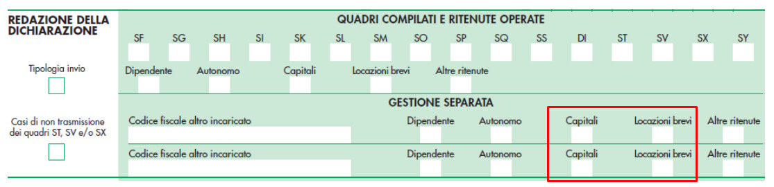 - laddove il modello sia inviato attraverso un “unico flusso”, questo dovrà contenente i dati riferiti ai diversi redditi gestiti (di lavoro dipendente, autonomo, di capitale, locazioni brevi e diversi), e comprendere, oltre al frontespizio, i quadri SS, ST, SV, SX, SY e DI, se ricorrono le condizioni per la relativa compilazione.