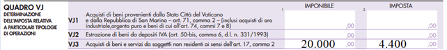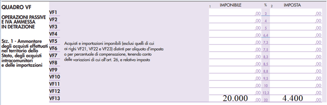 Ai fini della dichiarazione annuale Iva, invece, l’operazione dovrà essere riportata nel quadro VF (righi da VF1 a VF13) e nel quadro VJ. Così, ad esempio, in caso di un servizio di manutenzione su bene mobile reso da un prestatore Ue, di importo pari a 20.000 euro, a seguito dell’applicazione dell’inversione contabile il committente italiano dovrà compilare il Modello Iva come segue.