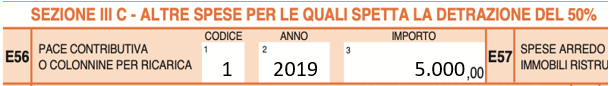 Pertanto, ponendo l’esempio di un contribuente che, nel periodo d’imposta 2019, abbia versato 5.000 euro per il riscatto di periodi non coperti da contribuzione, il rigo “E56” andrà compilato come di seguito riportato.