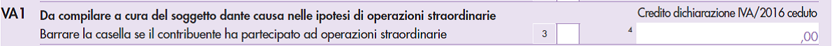 Il soggetto dante causa (locatore) deve presentare la propria dichiarazione esclusivamente con riferimento alle operazioni effettuate nell’anno 2016 relative alle attività non trasferite. In tale ultima dichiarazione dovrà essere barrata la casella 3 del rigo VA1 per comunicare che il soggetto ha partecipato ad un’operazione straordinaria e nel campo 4 dovrà essere indicato il credito emergente dalla dichiarazione annuale Iva 2016 ceduto, in tutto o in parte, a seguito dell’operazione.