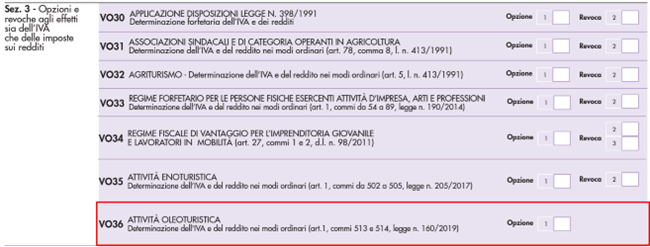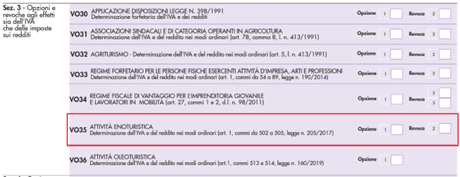 In ragione dell’entrata in vigore del regime dell’enoturismo a decorrere dal 2019, quest’anno, nella dichiarazione Iva 2023, debutta nel rigo VO35 della sezione 3, la casella 2, che deve essere fleggata da parte delle imprese agricole esercenti anche l’attività enoturistica che nel 2022 optano per la revoca dell’applicazione del regime Iva ordinario. Si ricorda, infatti, che l’opzione vincola per un triennio.
