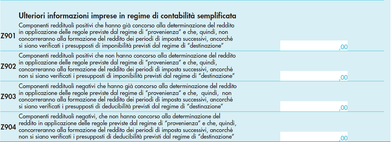 Nel modello, inoltre, è stata prevista una nuova sezione del quadro Z – Ulteriori informazioni imprese in regime di contabilità semplificata, composta dai righi da Z901 a Z904, in cui sono richieste delle informazioni al fine di valutare gli effetti, in fase di elaborazione degli indici sintetici di affidabilità fiscale, del passaggio da un regime di competenza al regime improntato alla “cassa” di cui all’articolo 66 Tuir.