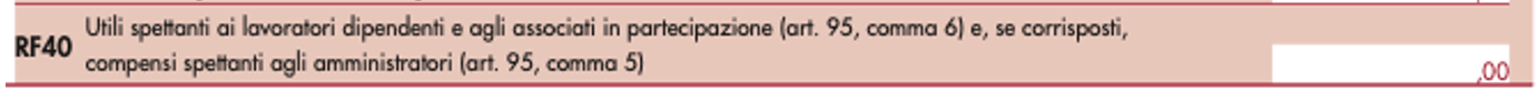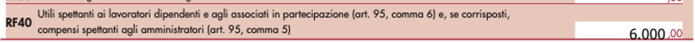 A tal fine, all’interno del rigo RF40, denominato “Utili spettanti ai lavoratori dipendenti e agli associati in partecipazione (art. 95, comma 6) e, se corrisposti, compensi spettanti agli amministratori (art. 95, comma 5)”, devono essere indicati i compensi corrisposti agli amministratori nel corso del periodo di imposta oggetto di dichiarazione e imputati al conto economico in un esercizio precedente.
