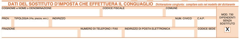 Inoltre, all’interno del riquadro denominato “Dati del sostituto d’imposta che effettuerà il conguaglio”, deve essere barrata la casella denominata “Mod. 730 dipendenti senza sostituto”.
