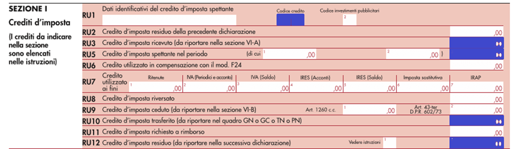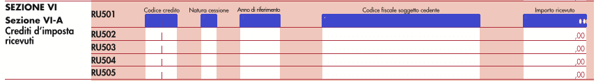 - rigo RU3 “ammontare del credito d’imposta ricevuto”, da compilarsi esclusivamente dai soggetti cessionari del credito. I dati del credito ricevuto e del cedente devono essere esposti nella sezione VI-A;