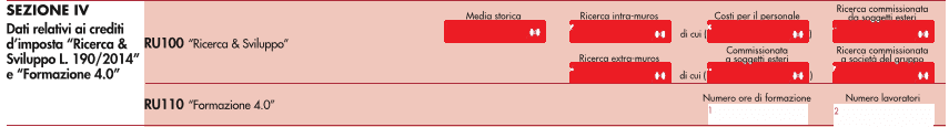 I dati fondamentali disposti dal Decreto attuativo (numero di ore di formazione e numero di lavoratori coinvolti nell’anno) sono dunque esposti nella sezione IV, al rigo RU110 “Formazione 4.0”.