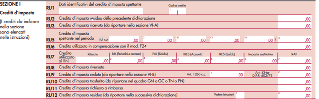 • sezione I riservata all’indicazione di tutti i crediti d’imposta da riportare nella dichiarazione dei redditi,