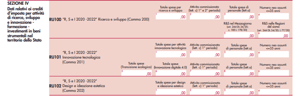 Al credito d’imposta R&S&I&D sono dedicati tre righi della sezione IV, i righi RU100, RU101 e RU102, per ciascuna delle fattispecie di attività ammissibili di cui ai commi 200, 201 e 202, articolo 1 L. 160/2019.