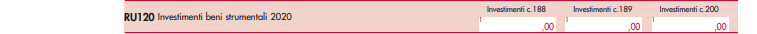 Al credito d’imposta per investimenti in beni strumentali nuovi realizzati nel 2020 secondo la previgente normativa della Legge di Bilancio 2020 è dedicato il rigo RU120, con espressa indicazione nelle tre colonne dell’ammontare complessivo degli investimenti effettuati in beni materiali ordinari (cod. H4), materiali 4.0 (cod. 2H) e immateriali 4.0 (cod. 3H) rispettivamente.