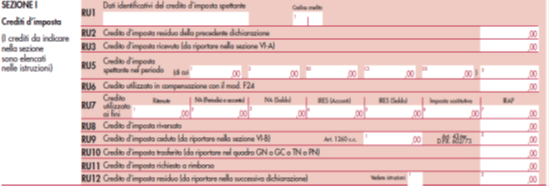 - al rigo RU3, l’eventuale credito d’imposta ricevuto quali soci di società trasparenti, beneficiari di trust, cessionari e, nel caso di operazioni straordinarie, va compilato dall’incorporante o dal soggetto risultante dalla fusione o dal beneficiario della scissione per l’indicazione del credito d’imposta della società incorporata, fusa o scissa. I dati del credito d’imposta ricevuto devono inoltre essere esposti nella sezione VI-A – Crediti d’imposta ricevuti;