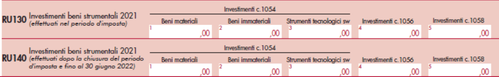 Inoltre, nella sezione IV del Quadro RU vanno compilati i righi RU130 e RU140 nei quali vanno indicati, rispettivamente, gli investimenti effettuati nel periodo d’imposta oggetto della dichiarazione modello Redditi 2022 e gli investimenti effettuati successivamente alla chiusura del periodo d’imposta di riferimento della dichiarazione modello Redditi 2022 ed entro il 31 dicembre 2022, per i quali entro il 31 dicembre 2021 si sia proceduto all’ordine vincolante e sia stato versato l’acconto del 20%.