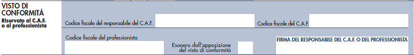 Negli specifici campi vanno riportati il codice fiscale del responsabile del CAF e quello relativo allo stesso CAF, oppure va riportato il codice fiscale del professionista che rilascia il visto di conformità e che deve inoltre apporre la propria firma.