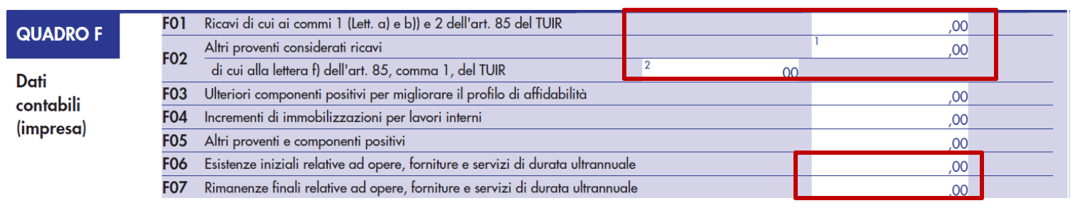 Pertanto, l’importo da indicare nel campo “Ricavi” corrisponde alla descrizione degli importi previsti nei seguenti righi del quadro F dei dati contabili: