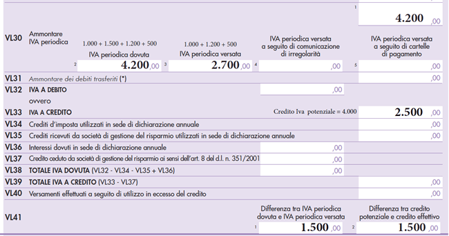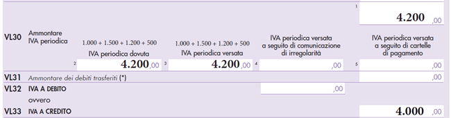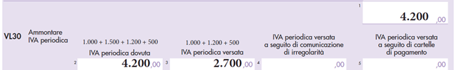 - nel campo 1, la differenza, se positiva, tra l’Iva periodica dovuta e l’Iva periodica versata (pari alla differenza tra il campo 2 e la somma dei campi 3, 4 e 5 del rigo VL30);
